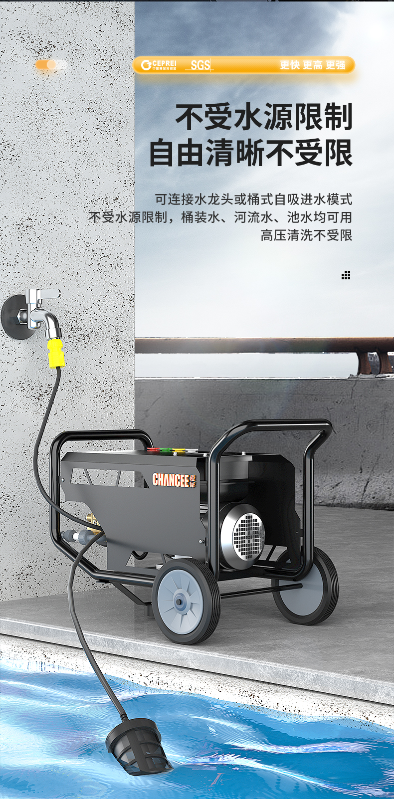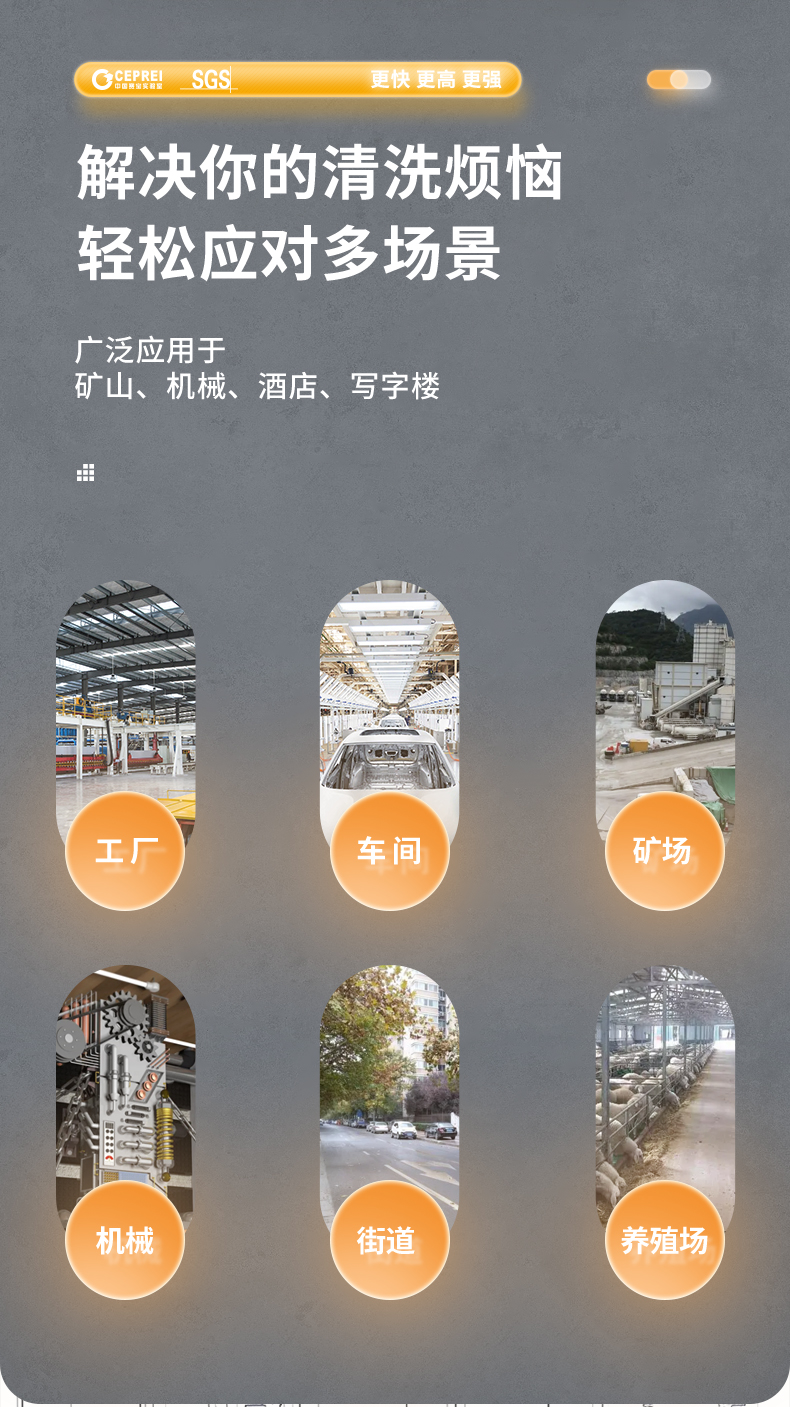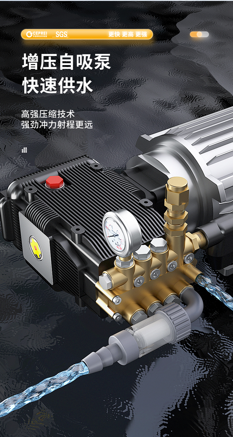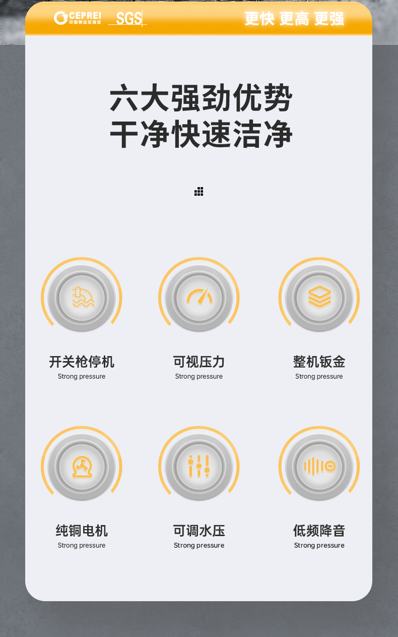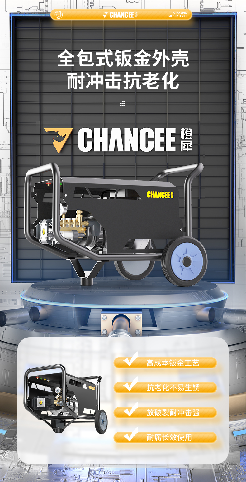 橙犀高壓清洗機(jī) YG1015:高壓沖洗,強(qiáng)效去污看的見(jiàn),廣泛應(yīng)用于各個(gè)場(chǎng)所,高成本鈑金工藝,抗老化不生銹材質(zhì),不受限制,清潔更流暢。