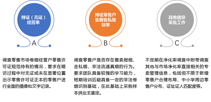 華夏經(jīng)緯根據(jù)區(qū)域經(jīng)濟、客戶分布、業(yè)態(tài)布局、卷煙銷量等因素,結合各地煙草市場的特點,因地制宜為監(jiān)測區(qū)域構建獨立的市場凈化率抽樣模型,科學、全面體現(xiàn)當?shù)責煵菔袌鰞艋省J袌鰞艋收{(diào)查的主要內(nèi)容包括(不限于)持證(亮證)經(jīng)營率和持證零售戶售假售私售非率等信息。
