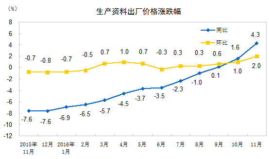 2016年11月份工業(yè)生產(chǎn)者出廠價(jià)格同比上漲3.3%