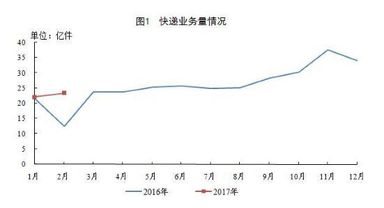 2017年2月郵政行業運行情況,全國快遞服務企業業務量完成23.4億件,業務收入完成292.2億元。