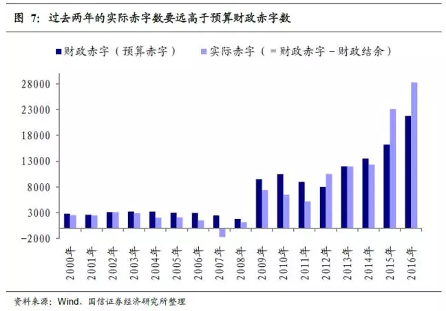 財政結余在2015年和2016年連續兩年被大量使用,這使得過去兩年的實際赤字數要遠高于預算財政赤字數(圖7)。以2015年為例,預算財政赤字為1.62萬億,而實際赤字高達2.31萬億,意味著通過使用財政結余是的赤字提高了近43%。