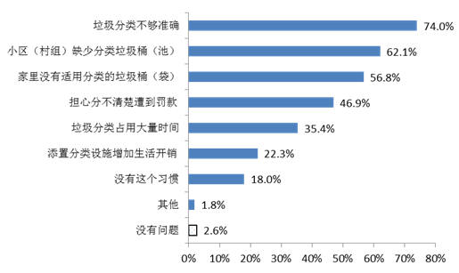 如果要進行生活垃圾分類,受訪居民表示個人或家庭主要擔心的問題是“垃圾分類不夠準確”,選擇比例占74.0%;其次擔心“小區(村組)缺少分類垃圾桶(池)”,占62.1%;第三是“家里沒有適用分類的垃圾桶(袋)”,占56.8%。此外,選擇“擔心分不清楚遭到罰款”“垃圾分類占用大量時間”的比例也較高,都在35%以上(此題為多選,相加不等于100%,詳見圖2)。
